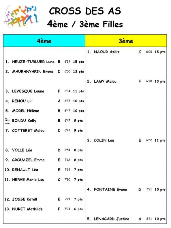 | Cross des AS 4e 3e Filles | 84.3 kio | Cross du collège : Résultats courses des AS | ||