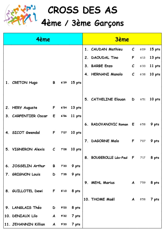 | Cross des AS 4e 3e Garçons | 116 kio | Cross du collège : Résultats courses des AS | ||