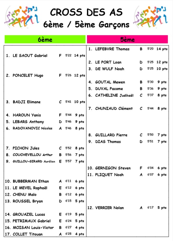 | Cross des AS 6e 5e Garçons | 122.6 kio | Cross du collège : Résultats courses des AS |
